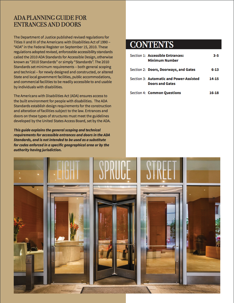 The four sections of the guide establish design requirements for doors and entrances in new construction or retrofit facilities subject to ADA standards – ensuring that state and local government buildings, public accommodations, and other commercial facilities are readily accessible to and useable by individuals with disabilities.