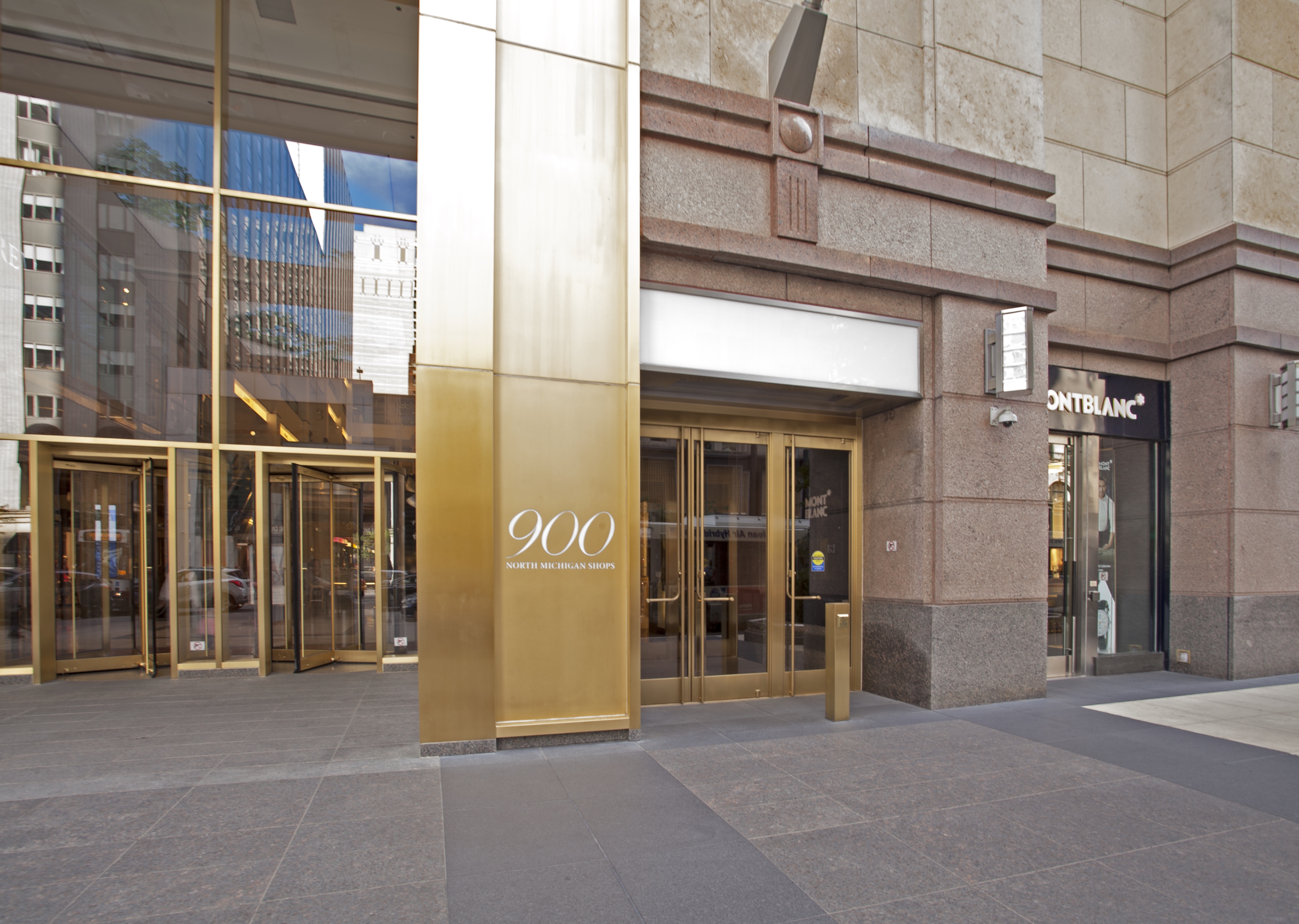 FALCONER, NY… The 900 North Michigan Shops in Chicago, IL has been an anchor of the Magnificent Mile since the building was completed in 1988, and the luxury mall recently underwent a renovation process to modernize both exterior and interior spaces. To complete the main entrance redesign on North Michigan Avenue, Ellison Bronze custom balanced doors provide the perfect complementary entrance to the central revolving doors.