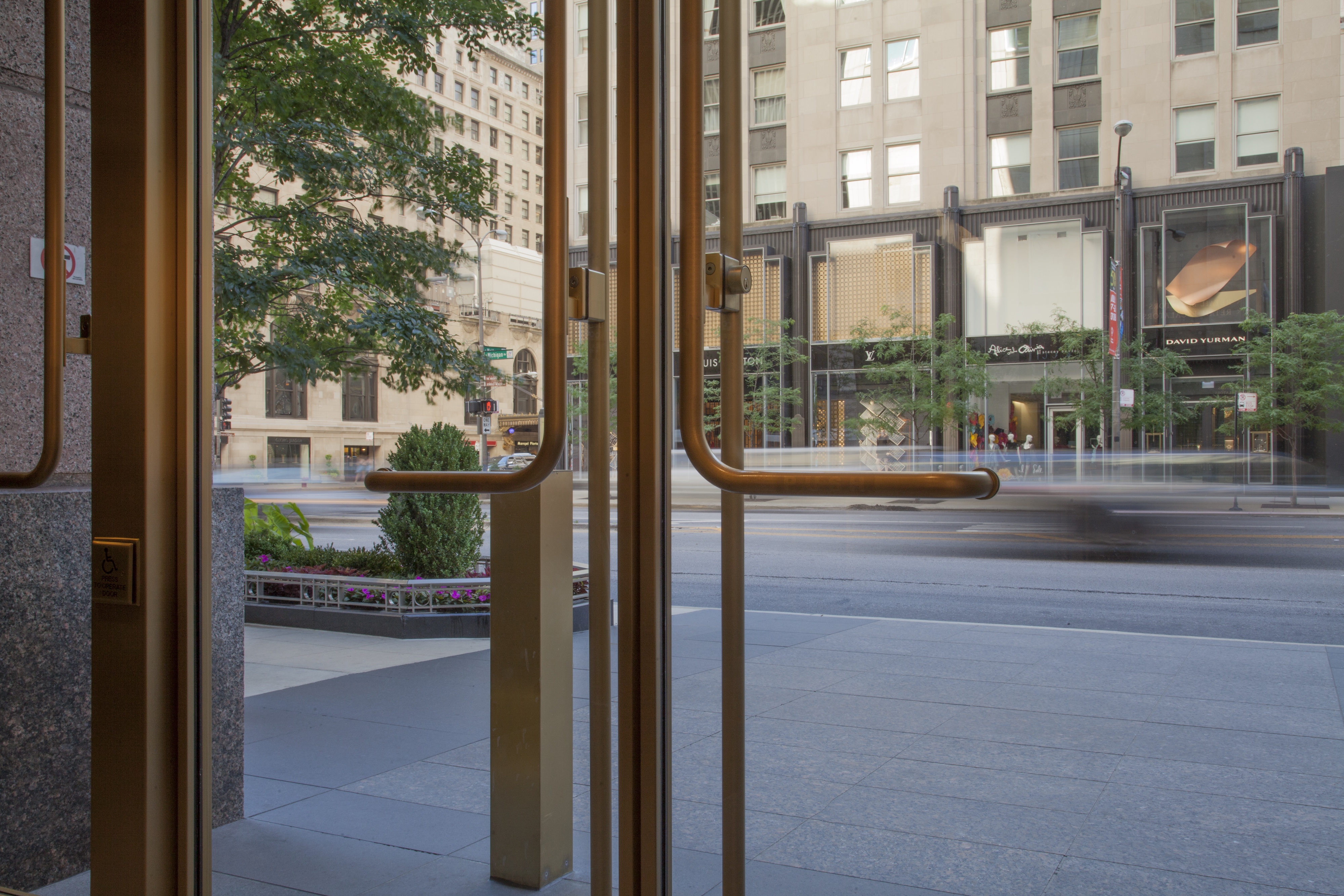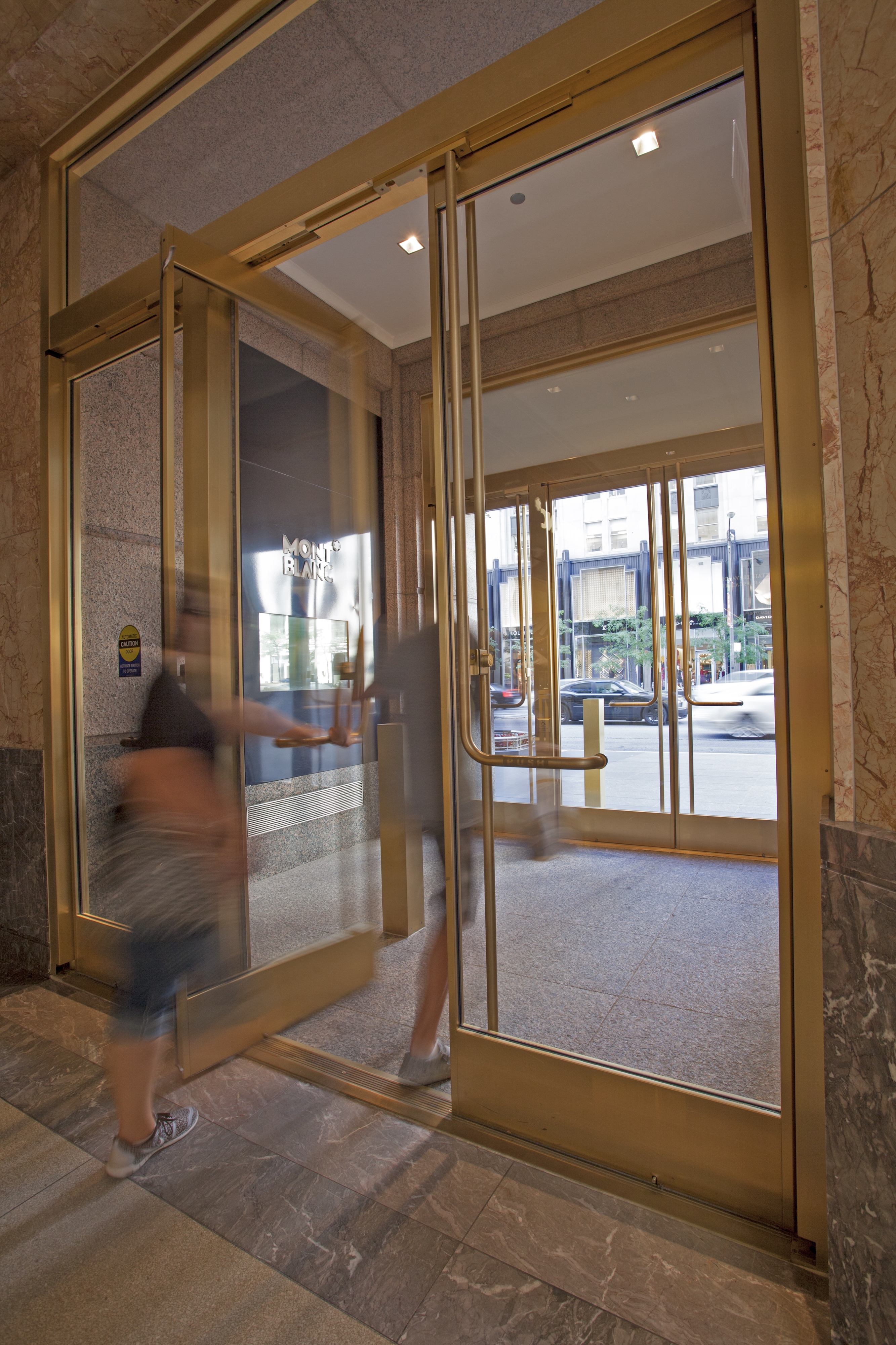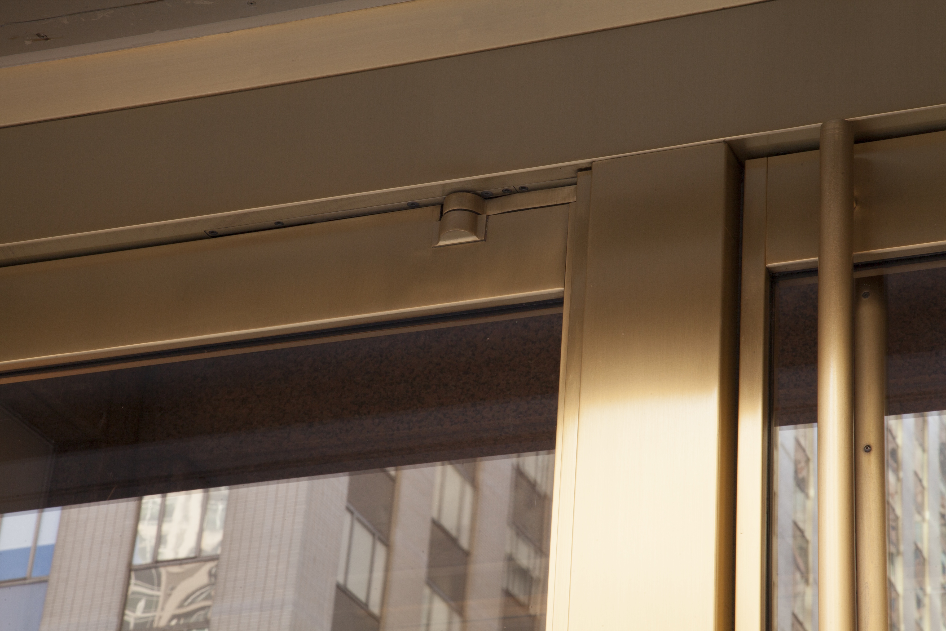 Manufactured from muntz bronze, a total of six Ellison balanced doors are installed at the entrance vestibule positioned to the right of the revolving doors. Both the exterior and interior Ellison entryways feature a pair of narrow stile tempered glass balanced doors, in addition to a single balanced door. The doors feature 4-3/4” high top rails, 10” high bottom rails, and 1-5/32” wide stiles, and are completed with ½” low-iron tempered glass factory glazed by Ellison. The interior entrance features a bronze and glass transom above the doors, expanding the open space around the frame.