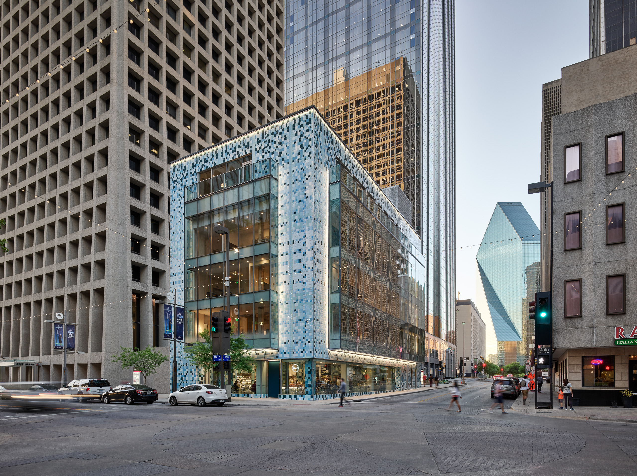 The inventive tile facade and rainscreen attachment system were designed and created by 5G Studio in collaboration with Cuban-American artist, Jorge Pardo, famous for his fusion of art, sculpture, and architecture. 5G worked alongside tile manufacturer Cerámica Suro to create a tile with a low water-absorption rate that would not flake or crack through Dallas’ yearly weather cycles.