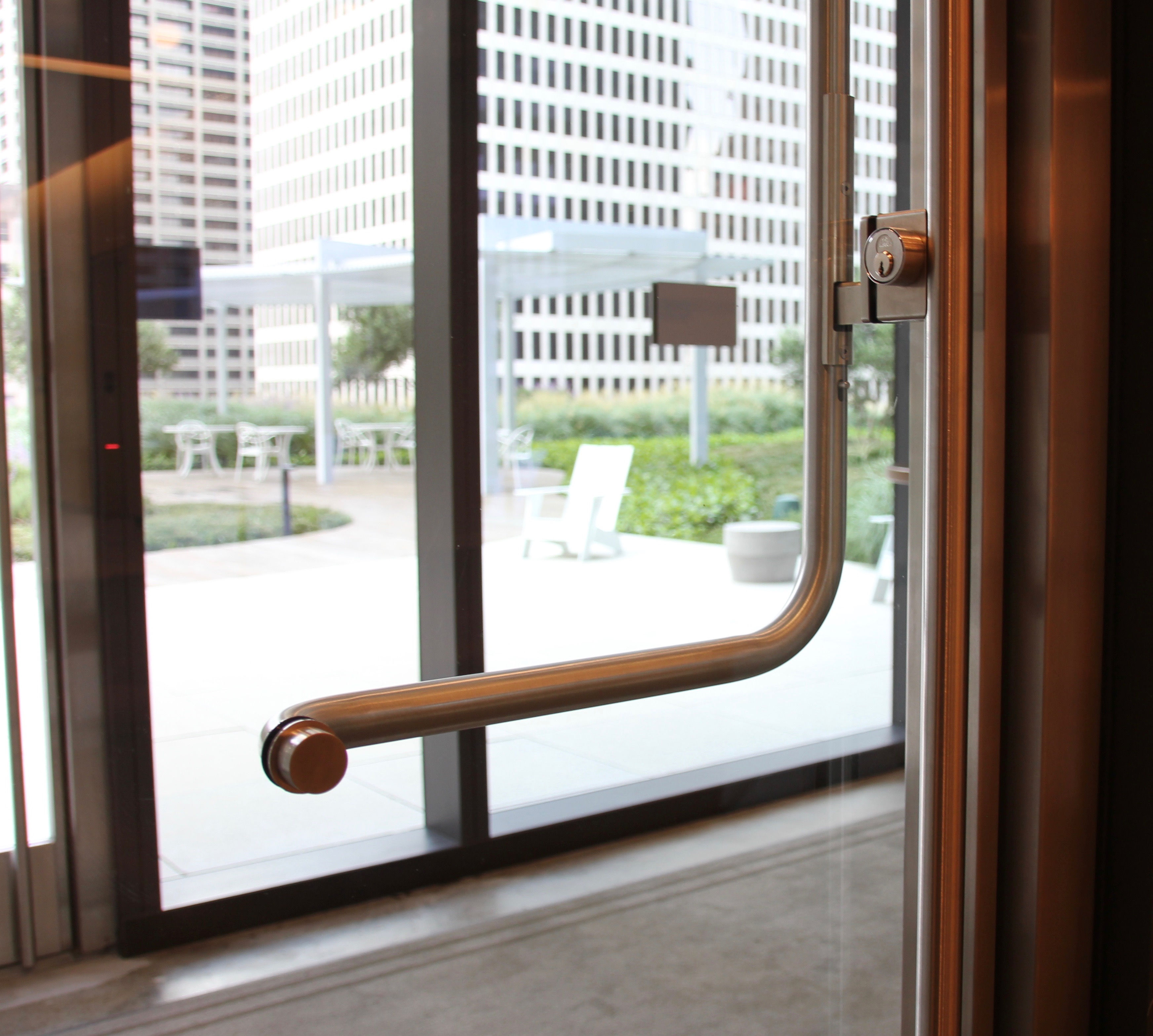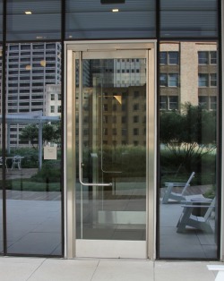 The stainless steel Ellison balanced doors were finished in US32D satin to match the ground floor’s entrance framing materials in addition to the canopy above the doors. These street entrances lead to a two-level, open-air lobby that also gives access to Houston’s underground pedestrian tunnel system, which features a selection of restaurants and retail establishments.