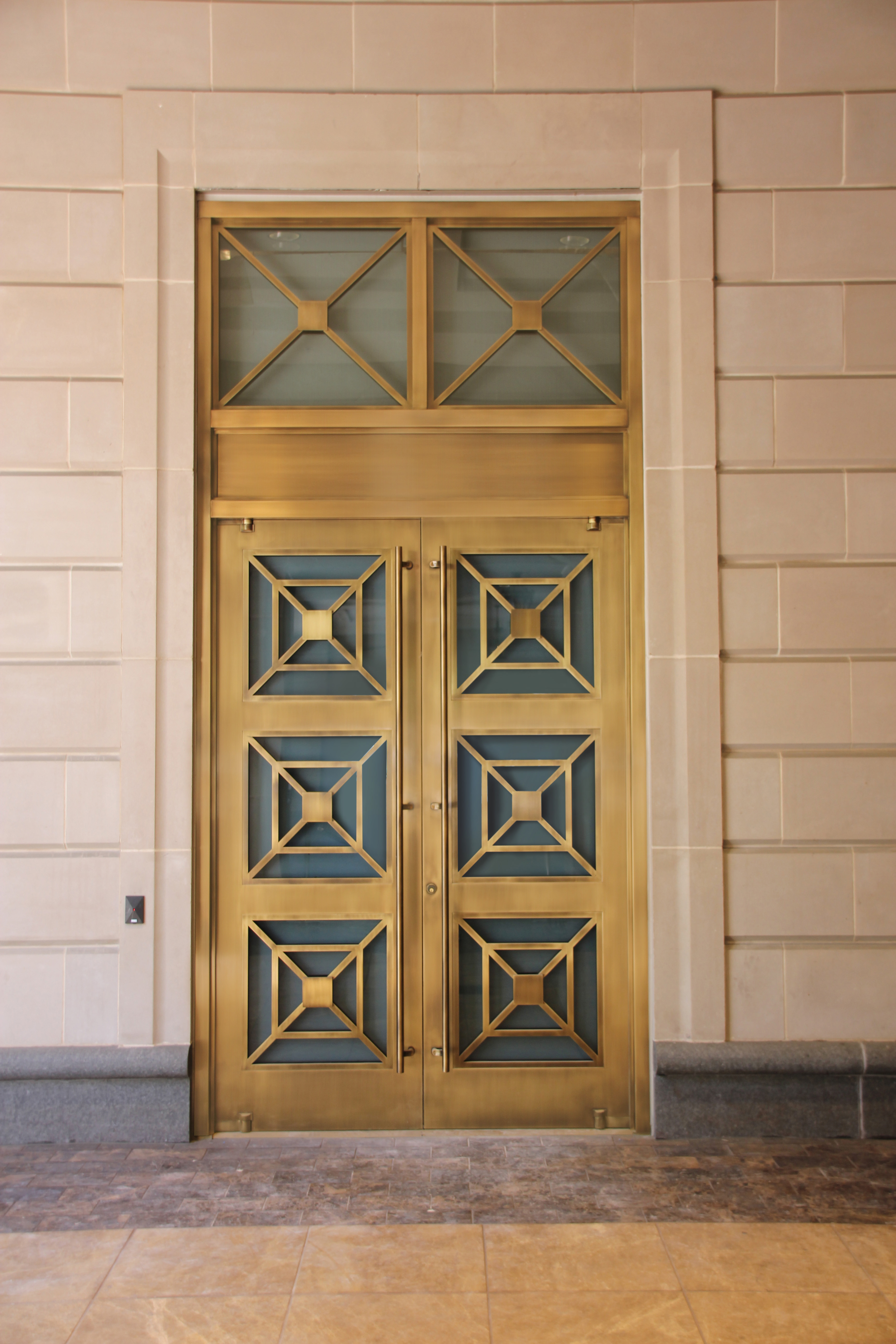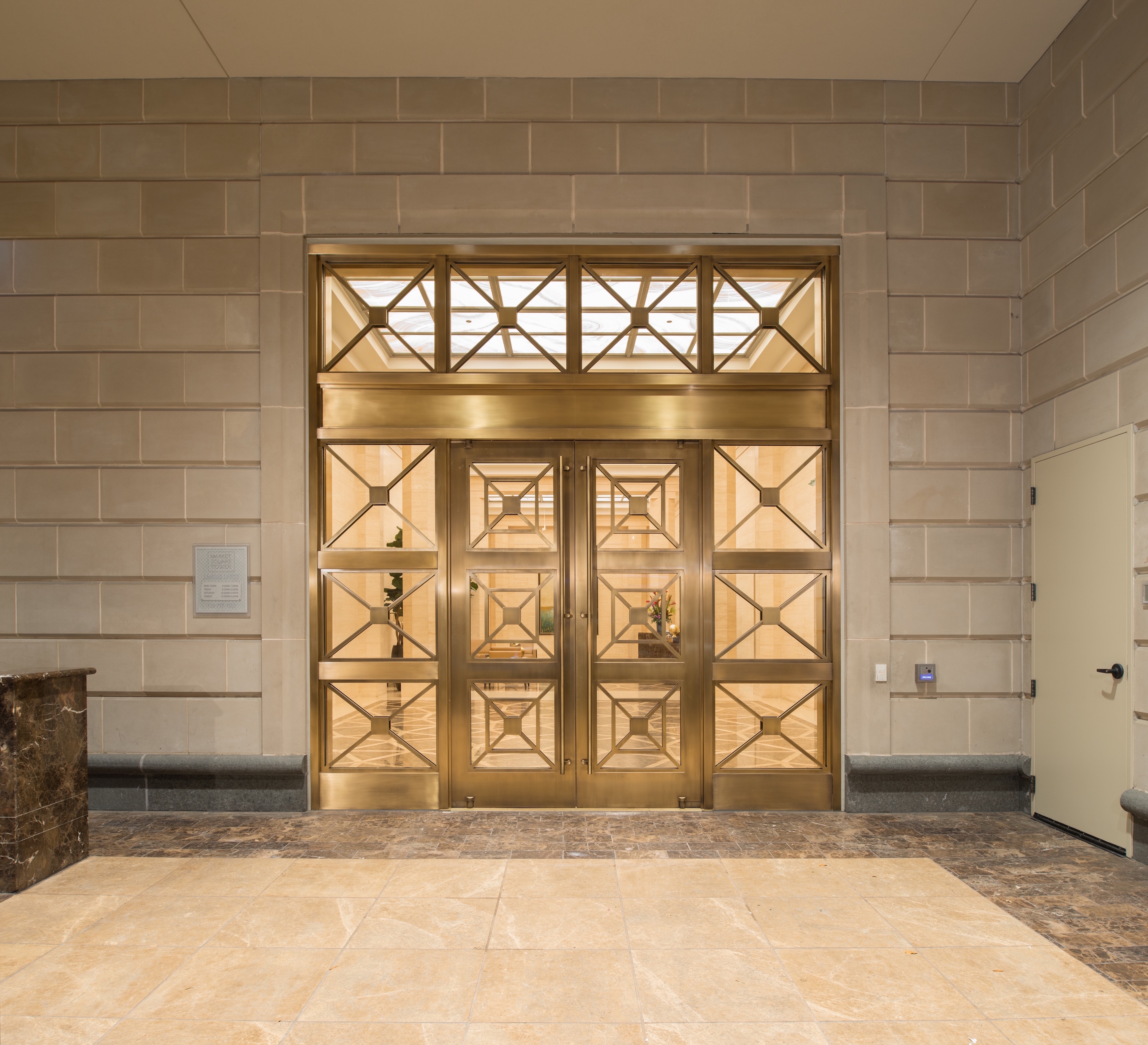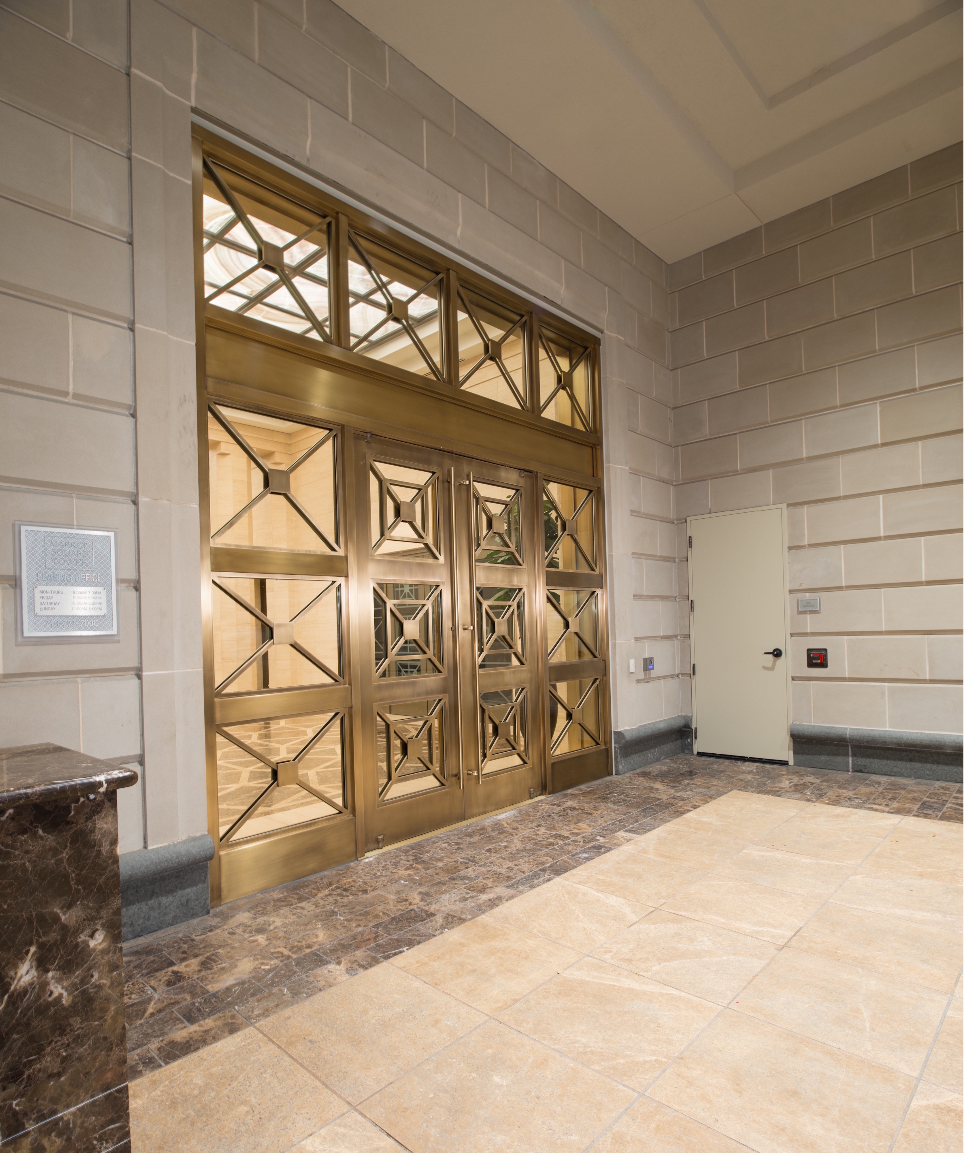 The doors at Market Square Tower are constructed of heavy and durable bronze but operate with ease. The projection of the door leaf is significantly reduced as well, owing to the inset pivot located at two-thirds the width of the door.