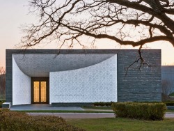 The Garden Mausoleum at Lakewood Cemetery required careful consideration of the intimacy of personal grieving and the shared rituals of commemoration. The 24,500-square-foot building is anchored by a two-level structure housing a committal chapel and a reception space. The building then unfolds into a series of garden-level chambers for interments. The chapel and reception space are the more active, communal spaces; the garden-level chambers are quiet and contemplative. Still, with light-filled rooms connected to a landscaped garden, this project challenges the paradigm of mausoleums as dark, introverted places. Each burial chamber is different, and each frames a unique view through large windows or skylights.
