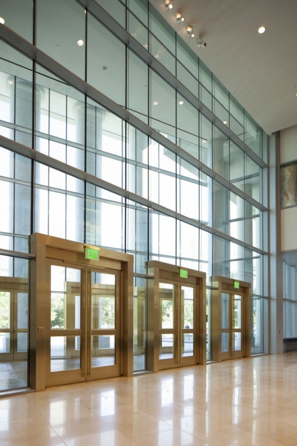 Ellison provided five pairs of custom monumental balanced door units, including hardware and immediate framing. Four of the pairs are an impressive 12-feet tall. Each of these doors includes three raised bronze panels surrounded by a solid bronze bar. The construction and hinging hardware allow the sizable doors to be opened easily. The balanced doors pivot at two-thirds the width of the door, creating a balance that distributes the weight so the door requires little force to open. The inset balancing point allows for an easier open force, even against external wind and internal building pressure, despite the added weight of the sturdy components.