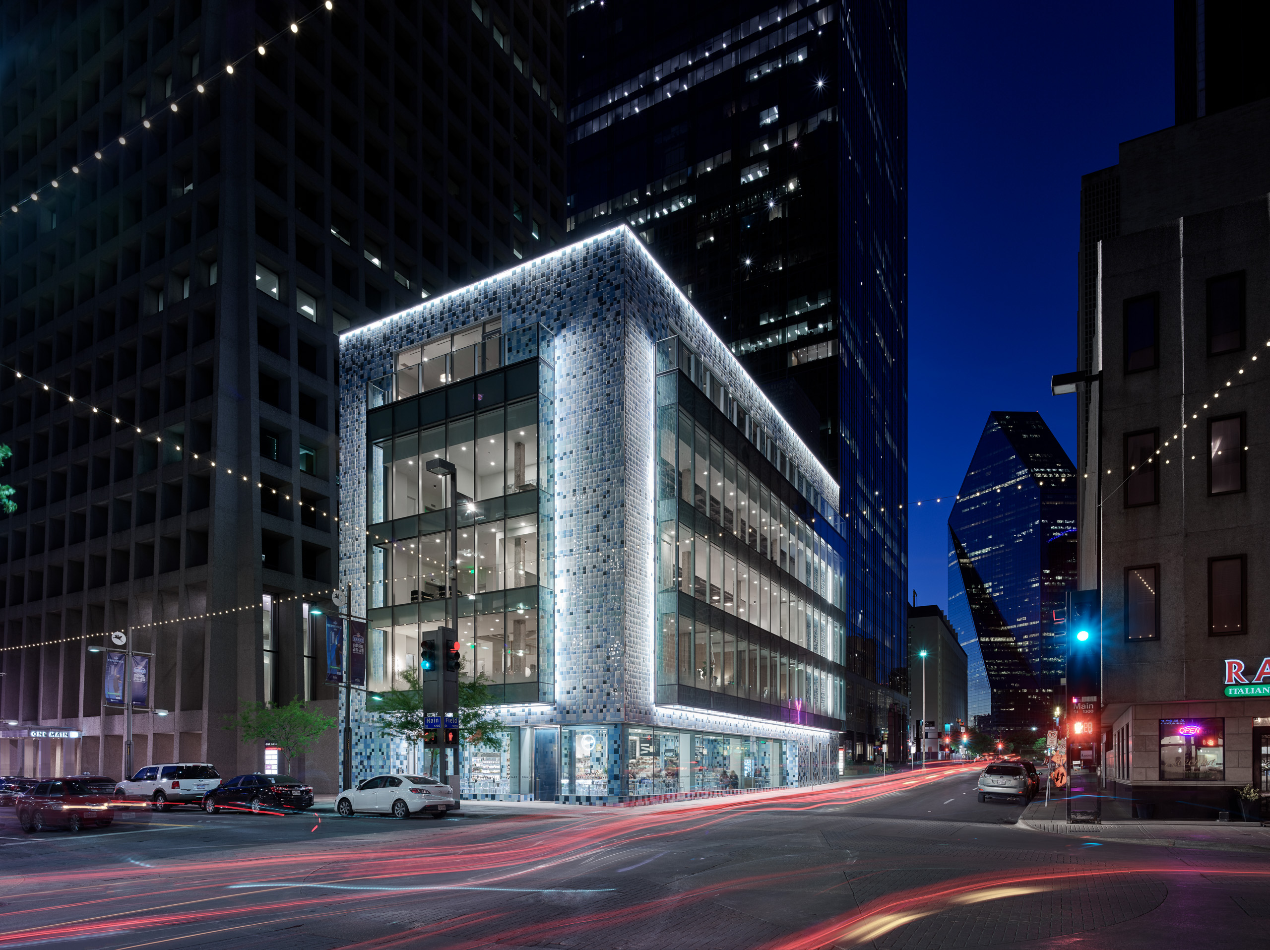 Built in 1958, 1217 Main Street in Dallas, TX is a mid-century modern commercial building that originally served as a bank and also housed office space. In the early 2000s, the brick building had reached the end of its lifespan and underwent a complete renovation to reflect its new occupants: a nightclub and a restaurant. It wasn’t until 2017 that construction began on 5G Studio Collaborative’s latest revamp of the 28,000 sq. ft. site, which included the addition of a fifth story, an innovative rainscreen facade featuring ceramic tiles in varying shades of blue, and Ellison Bronze custom balanced doors; including one formed-up, solid aluminum door painted to complement the aesthetic of the exterior “mosaic” of ceramic tiles.