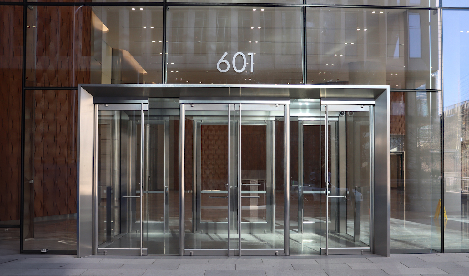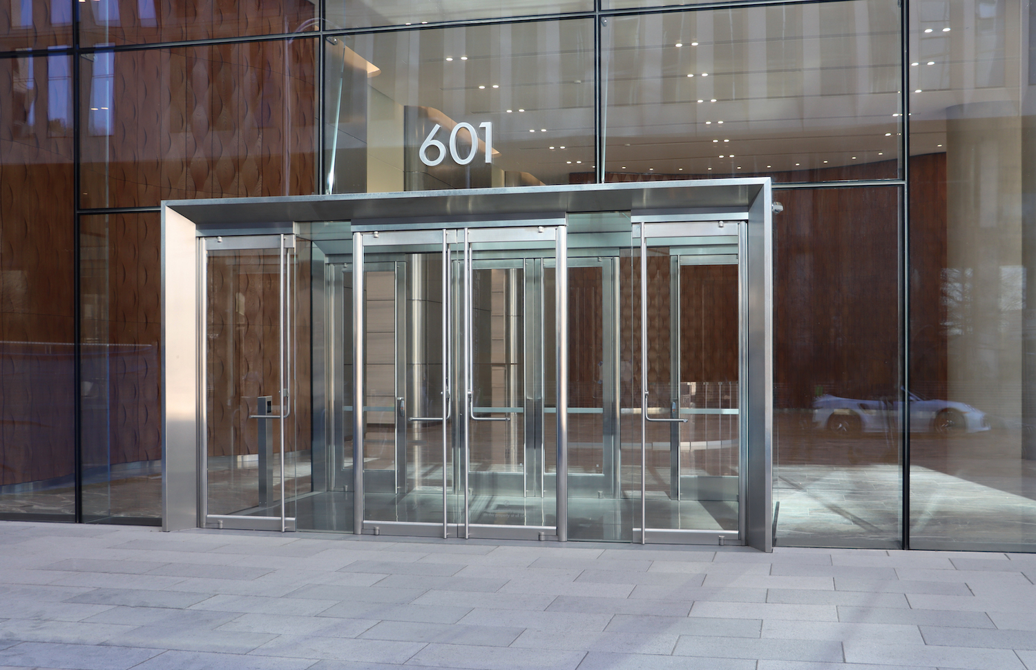 The Ellison custom balanced doors are installed at adjacent corners of the building at identical entrances. Both of the vestibule-type entrances feature a pair of balanced doors flanked by single-leaf doors on each side. There is an additional pair of Ellison balanced doors inside the building leading to the parking shuttle lobby. Finally, three more pairs of “medium stile” balanced doors are installed within an interior security wall, and a single, non-balanced swing door stands at the entrance of the security booth.