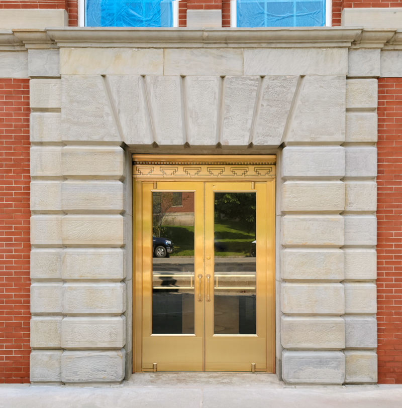 In 2020, Ed Tronetti, maintenance director at McKean County, identified the manufacturer of the original doors as Ellison Bronze and initiated conversations focused on restoring the door closure hardware only. Fast forward to 2022, and McKean County had widened the scope of the project, committing to constructing a new roof, repointing the sandstone on the exterior, rebuilding the back patio, repaving an access street to the building, adding a heated sidewalk, and restoring both the clock tower and the entrance doors. That meant restoring all entrance systems in their entirety.