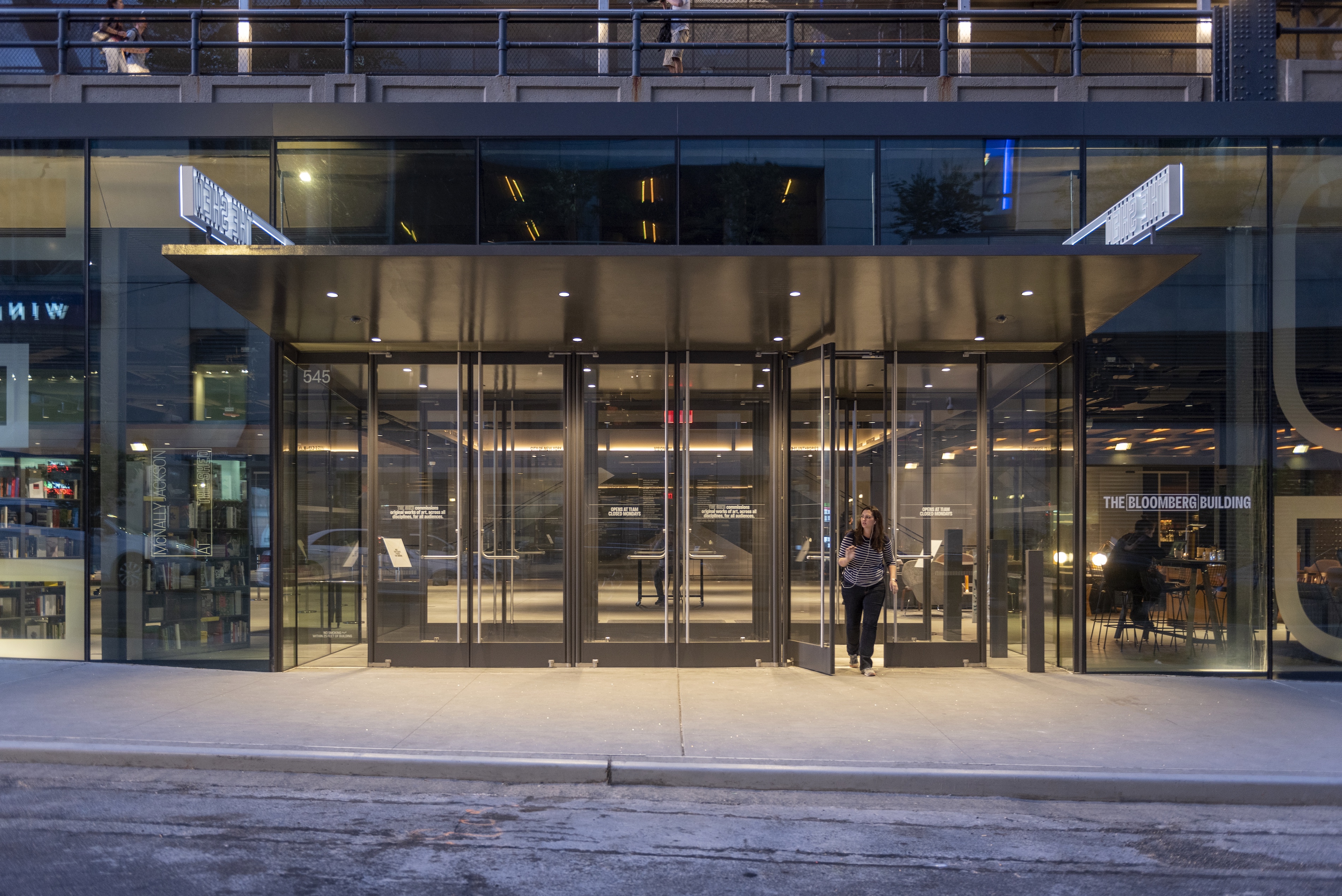 The West 30th Street main vestibule entrance of The Shed, designed by Diller Scofidio + Renfro and developed by facade specialist CS Facades, is located under the High Line park and features six pairs of Ellison custom balanced doors that give entrance to the main building lobby space. Ellison also has two additional entries with sidelights that lead to The McCourt and other event spaces within the building’s upper levels.