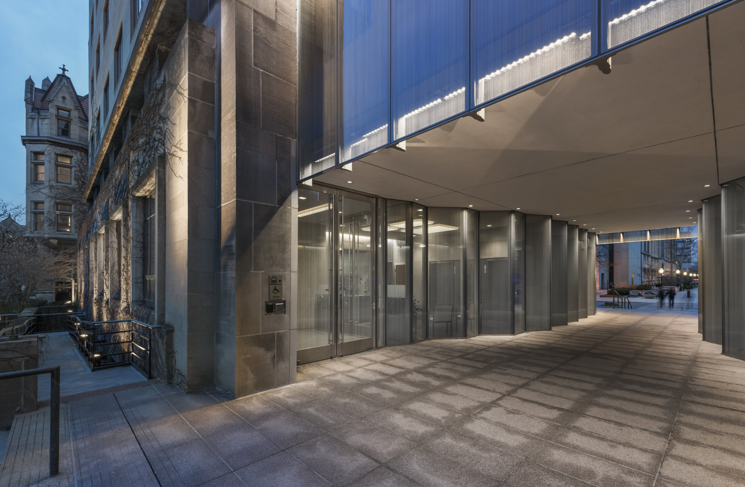 Steady pedestrian flow calls for quick and easy-opening doors. Accommodating the rush of students moving across the University of Chicago daily, Ellison balanced doors operate smoothly among heavy foot traffic. These narrow stile tempered glass doors are made of stainless steel and include Ellison PowerNow power operation functionality, providing an accessible entrance for all users.